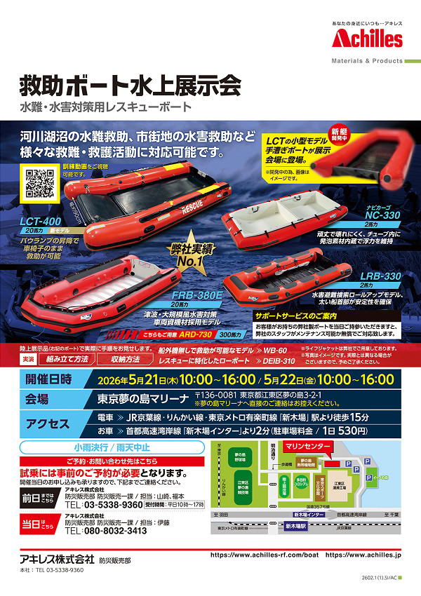また、今年は現在各企業様や消防・警察の方々の保有されているアキレスボートをご持参いただければ、メーカーの目で修理可能な状態か等確認させていただきます。