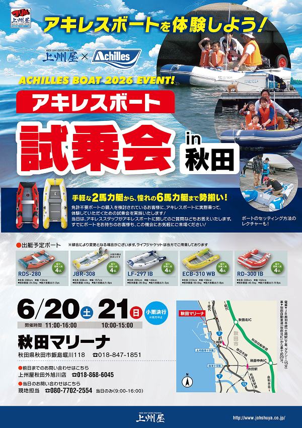 手軽な2馬力艇から憧れの6馬力艇まで勢揃い!また、当日はアキレススタッフがアキレスボートに関してのご質問なども現地にてお答えいたします。すでにボートをお持ちのお客様も、この機会にお気軽にご来場ください。